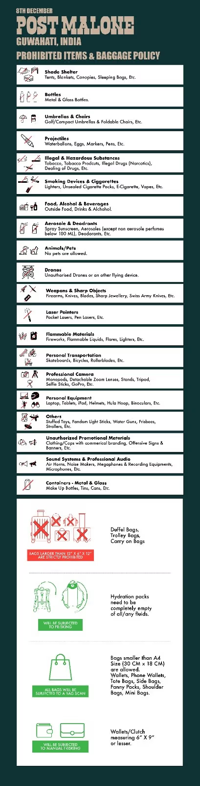 Bags smaller than A4 size/30 cm x 18 cm (i.e. wallets, phone wallets, side bags, fanny packs) are allowed. Backpacks, laptop bags, and small suitcases are not allowed. All bags will be subjected to a bag scan/search.